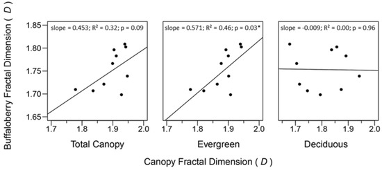 General linear models describing relationships between fractal dimensions of buffaloberry shrubs and forest canopy categories. Asterisks indicate a significant effect (α = 0.05). 95% confidence intervals for coefficient estimates of total canopy, evergreen, and deciduous categories were (−0.091, 0.996), (0.064, 1.078), and (−0.401, 0.383), respectively.