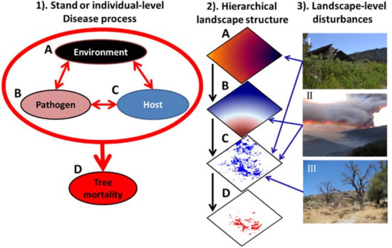 Linkages between forest pathology and landscape ecology with example landscape-level disturbances which can influence disease emergence and impacts. The traditional disease triangle (1) factors (A–C) are shown simultaneously in the spatial context of landscape ecology (2) along with landscape-level disturbances that are likely to interact with disease (3). Environment (1-A and 2-A) is shown on a gradient along with a waveform pathogen invasion process (1-B and 2-B) and realistic spatial heterogeneity of host distribution (1-C and 2-C) and mortality (1-D and 2-D). Examples of interactive disturbances are shown with arrows indicating the components of landscape structure and the disease triangle that are impacted: Invasive plants competitively inhibit forest host reestablishment following land abandonment with impacts to environmental conditions and host distribution (I—Genista monspessulana invasion of an old vineyard), fire can alter host and pathogen distribution (II—Soberanes Fire 2016, Big Sur—Photo credit K. Frangioso), and emergent insect outbreak-caused mortality of host populations (III—Agrilus coxalis mortality of coast live oak).