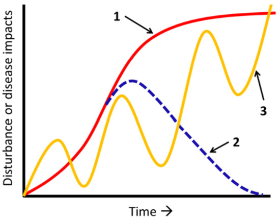Third and fourth-order disease–disturbance interactions remain minimally studied although these are certain to represent future management challenges. Fire-prone regions where multiple fires and disease events occur over time could be shaped by these factors. Paine et al. [56] and Johnstone et al. [17] suggested several general ecosystem trajectories resulting from disturbance interactions that tend to focus on transitions between stable ecosystem states or temporary states associated with recovery (Figure 2; examples 1 and 2). We recognize that these expectations may also fit disease–disturbance interactions. For example, disease-center formation in the White Mountains of New Hampshire resulting from wind impacts is a temporary ecosystem state [35,61]. Similarly, it has not yet been shown that sudden oak death–fire interactions will lead to long-term and permanent shifts in forest structure although it is plausible that increased tree mortality and soil nutrient loss will result in these changes. However, biotic disturbances are strongly influenced by the coincidence of environmental conditions favorable to establishment or outbreak suggesting that dynamic ecosystems should be expected in some circumstances (Figure 2; example 3). Oscillating dynamics where host populations recover and provide the basis for future outbreaks are a common pattern in many tree mortality events driven by native organisms [35,51,62]. Intensifying outbreaks resulting from climate-change-associated shifts in temperature, precipitation, and resulting host-stress appears likely given documentation of landscape-level declines in host physiological status and its impact to plant defense [3,4,37].