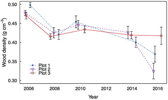 Temporal changes in wood density across the three study elevations (plots). Plot 1 was located at an elevation of 1477 m, Plot 2 at 1698 m, and Plot 3 at 2053 m (note that tree species varied across elevations too; Table 1). Plot did not significantly affect wood density in 2016 according to ANCOVA (F2,66 = 0.74, p = 0.48), but log diameter did (see Figure 3). Error bars indicate ± 1 SE of the mean.