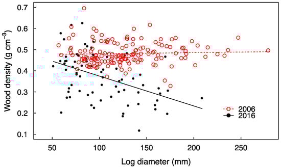Effect of log diameter on wood decomposition. The density of wood was independent of diameter in 2006 (ANCOVA; F1,70 = 0.28, p = 0.6). In 2016, the average density was lower than in 2006 for all the ranges of diameters considered in the study and negatively affected by log diameter (ANCOVA; F1,70 = 18.4, p < 0.001), indicating that larger-diameter logs decomposed faster than smaller logs. The figure shows the measured values of each log and simple linear regression lines for each year.