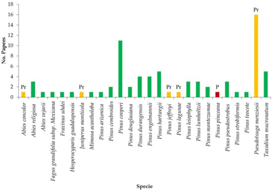 | No | Year | Journal | Authors | Title | Family | Tree Species | Ecosystem (INEGI Classification) | Region/State | Area of Application | Variable |