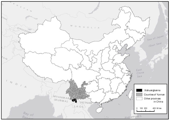 Figure 1. Map of the study area: Xishuangbanna Dai Autonomous Prefecture, Yunnan, China, adapted from Kim [46] with permission.