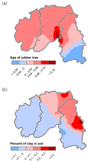 Similarly, although in the global model the Percent of clay in soil is found positively related to Latex yield (Table 1), according to the local model, that positive relation is only valid for the northeastern part of the study area (Figure 3b). There, the clay-rich soil holds more water and nutrition than does soil with less clay, offering conditions that can promote the productivity of natural latex yield. In the rest of the study area, clay-rich soils seem to be vulnerable to aridity and hardening of the soil.