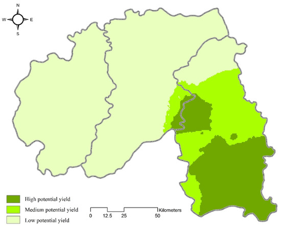 Figure 4 demonstrates the outcome of the ISODATA application on the spatial surfaces. It has been found that three groups are optimal to classify Banna’s landscape in terms of latex potential yield. The dark green indicates the region with the highest potential yield for latex production; the medium and light greens show the areas of medium and low potential yields, respectively. Mengla contains most of the areas with high and medium potential yields. Compared to this fertile land, Jinghong and Menghai are relatively less suitable for producing natural latex (Figure 4).