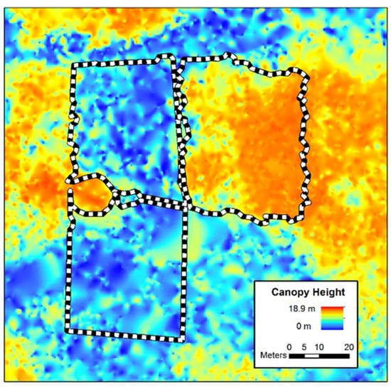 However, new developments with unmanned aerial vehicles (drones) have significantly lowered the cost and time needed to conduct inventories [,,]. Because of this, drones offer the possibility of empowering landowners or small organizations to conduct forest inventories more frequently. Nowadays, one can buy a high-quality drone and equip it with an RGB digital camera, thereby creating a homemade remote sensing tool [,]. Photos taken from these cameras can be processed with open-source software (e.g., Ecosynth) to construct a 3D model using structure from motion algorithms [,]. These algorithms identify features (e.g., trees, buildings) on overlapping photos taken from different angles and reconstruct the features’ 3D structure [,]. The resulting data is a collection of RGB points that represent the 3D surface of the objects imaged by the drone. This method has been used to produce LiDAR-like results in measuring canopy heights, structure, roughness, and biomass [,,,].