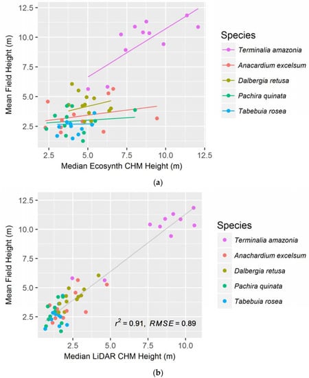 As expected, drone-derived point clouds more accurately predicted canopy heights during the dry season when used with a LiDAR DTM than with an Ecosynth DTM. When surveying multiple species at a time, drone point clouds, combined with LiDAR DTM, can predict plot-level height comparably to what has been measured with LiDAR point clouds and LiDAR DTMs [,]. Comparing the species-specific height models demonstrates that while the LiDAR CHM more accurately predicts height for all species than the Ecosynth CHM, both CHMs demonstrate the same order of predictive ability (see Table 1). Height of T. amazonia and D. retusa were predicted most accurately—with the T. amazonia models performing significantly better than any other, regardless of which terrain model was used.