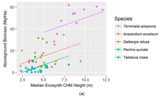 Both the species-specific height and biomass models demonstrate a significant difference in predictive ability between species. The Ecosynth CHM and LiDAR CHM most accurately predicted height and biomass for T. amazonia and A. excelsum, and least accurately predicted both metrics for D. retusa, T. rosea, and P. quinata. The two species with the most accurate models are both single-stemmed evergreen trees while the other three are deciduous, and one of them is multi-stemmed. These results suggest that in the steepland tropics, drone point clouds can be used to accurately measure the plot-level height of tall evergreen trees but not small deciduous ones during the dry season. This difference is likely because the structure from motion algorithms is not as effective when the drone photos contain less visible features (i.e., leaves) to identify. While other researchers have shown a distinction between leaf-on and leaf-off drone accuracy [], this is the first study to isolate the experiments on a per-species basis using tropical timber species. This is important because many plantations in the tropics are either subdivided into mono-specific patches or are entirely monocultures [].