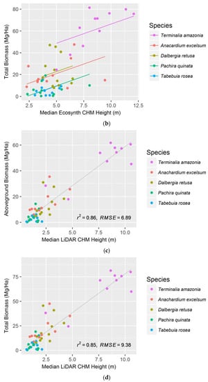 In terms of biomass, the LiDAR CHM more accurately predicted AGB and TB than the Ecosynth CHM for every species except for T. amazonia. The LiDAR CHM most strongly predicted A. excelsum while the Ecosynth CHM most strongly predicted T. amazonia. The species with the lowest predictive ability for AGB and TB for both models were D. retusa and P. quinata. The results also demonstrate that the Ecosynth CHM and the LiDAR CHM could predict TB with nearly identical regression coefficients to AGB models. This is an important step in carbon measurement studies because many remote sensing studies up to this point have focused primarily on AGB, disregarding a significant portion of a forest’s carbon—that which is below ground [,,,,,,]. By incorporating belowground biomass into calculations, we can produce more accurate carbon estimates, and with the aid of drones, do so faster and cheaper in monoculture plantations.