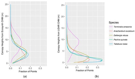 The vertical canopy profiles correctly capture the distinction in vertical stature between species but the LiDAR profiles better reflect the known vertical structure distribution of the species. This was determined by comparing the mean heights from the profiles of the different species to the mean heights of each species from the field data (see Figure 5a,b). For every species except for T. amazonia, the Ecosynth CHM profile overestimated field height while the LiDAR CHM provided a much closer approximation to field height.