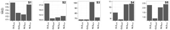 Calculated model-based variance estimates for S1, S2, S3, S4, and S5. OLSLOG and OLSSQRT represent the empirical approach to modelling. NLSMCH and NLSTCH represent the semi-empirical approach to modelling.