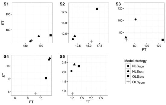 Calculated model error (ME) for S1, S2, S3, S4, and S5. OLSLOG and OLSSQRT represent the empirical approach to modelling. NLSMCH and NLSTCH represent the semi-empirical approach to modelling.