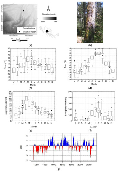 (a) Location of the study area, (b) photograph of a sampled tree, and (c–g) monthly climate conditions: (c) maximum temperature, Tmax, 1946–2015 period; (d) minimum temperature, Tmin, 1946–2015 period; (e) evaporation, 1965–2010 period; (f) precipitation, 1946–2015 period; (g) SPEI drought index, period 1946–2015. Blue and red bars indicate positive and negative SPEI values corresponding to wet and dry conditions, respectively.