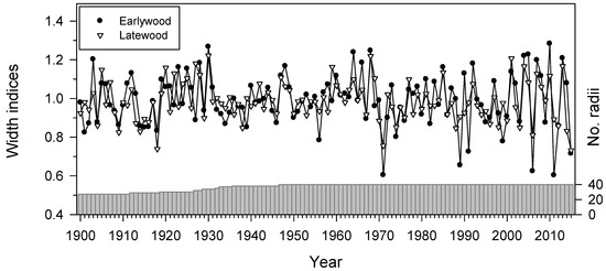 High-frequency variability observed in earlywood and latewood width indices of Picea chihuahuana since 1900. The bars show the number of measured radii (right y axis).