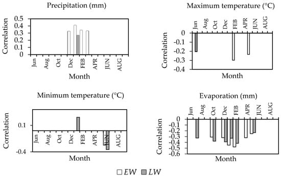 Precipitation from December–March had a positive relationship with EW, while for LW it only had a positive relationship in January (Figure 3). Regarding the maximum temperature, a negative association was obtained for EW in February and May of the year of tree-ring formation, whereas LW showed a negative relationship with June minimum temperatures. January minimum temperatures showed a positive relationship to LW, but negative relationships were observed with both EW and LW, considering June minimum temperatures. EW and LW showed negative correlations with evaporation data of the previous October, but also in winter (December–February) of the current year, in spring (April, May) in the case of EW, and May for LW.