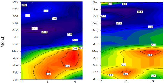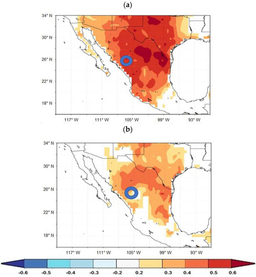 Finally, field spatial correlations were calculated using Pearson coefficients. In this correlation, the EW and LW series and six-month long SPEI data (gridded at 0.5° resolution) were related from January to May considering the 0.5° grids covering Mexico and the southern conterminous USA. The KNMI webpage was used for these analyses [37,38].