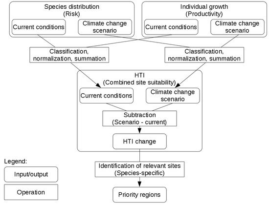 Workflow of how species distribution and growth projections were combined in the happy tree index (HTI) and priority regions were identified. Species distribution and individual growth were projected for current conditions and for the climate change scenario separately. For current conditions and the climate change scenario, respectively, distribution and growth were classified, normalized and summed to obtain the HTI. The difference between HTI for current conditions and HTI for the climate change scenario was used to derive HTI change. Species-specific relevant sites were calculated based on the national forest inventory data. After application of a buffer and applying a forest mask, this raster was used to mask the HTI change map for each species. Strong negative changes for current stands were used to identify priority regions for climate change adaptation.