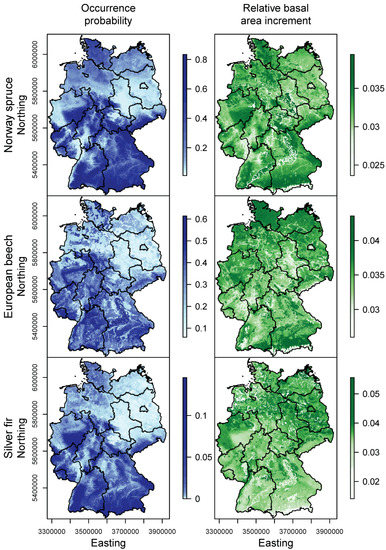 For silver fir, which co-occurs with spruce and European beech, intermediate conditions were identified all across Germany with the exception of some low mountain ranges. Under climate change, this pattern remained largely unchanged. This was caused by the contrary pattern and also the contrary development of the occurrence probability and growth (Figure 3). Occurrence probability increased for higher and decreased for lower elevations, whereas growth behaved contrarily.