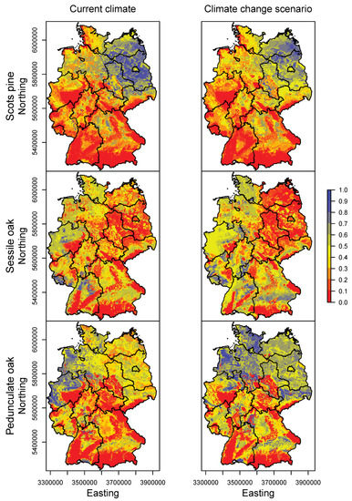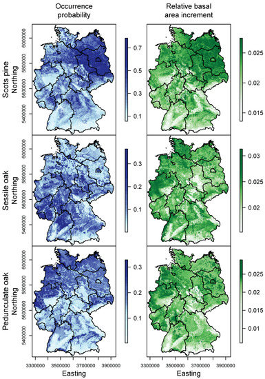 The other three species—Scots pine, sessile and pedunculate oak—were distributed in warmer areas. For Scots pine, stronger growth as well as a higher occurrence probability were modeled for warmer and drier conditions (Figure A2). Regions with higher occurrence probability also showed good growth (Figure 2 and Figure A4). Main occurrences were at low altitudes such as the North German Plain, the Upper Rhine Valley, or Central Franconia. Scots pine can be considered the most drought tolerant out of the six considered tree species.