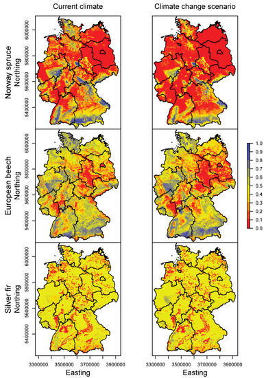 Spatial projections for species distribution and tree growth provide information on current and future site suitability. Climate change impact assessments often use continuous maps of changes in site suitability to evaluate the potential of species under climate change. However, to assess the severity of climate change impact, a crucial question is what will happen to current forested areas. Which current stands with a certain species composition need to be actively adapted by management measures and which stands will be less affected due to an already suitable species composition? In forest management, information on regions for which strong negative changes can be expected—i.e., vulnerable areas—helps to concentrate resources. On the basis of maps for current and future site suitability, regions can be identified which are expected to show strong negative changes in the next decades [15,16,18]. In consideration of forested area and its current tree species composition and how site suitability for important tree species is likely to change, priority regions for adaptive management can be identified.