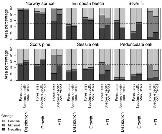 Area budgets for minimal, positive and negative HTI changes were calculated. In doing so, minimal changes of HTI were defined as being smaller than the 5% quantile of all absolute values of changes. This was done separately for forest area (CORINE forest mask) and species-specific area (species masks combined with CORINE forest mask). The area budgets were calculated for the whole of Germany and for thirteen federal states excluding the city states Berlin, Hamburg, and Bremen.