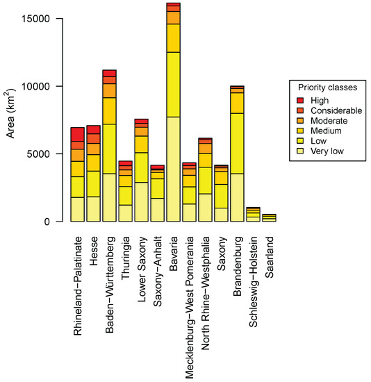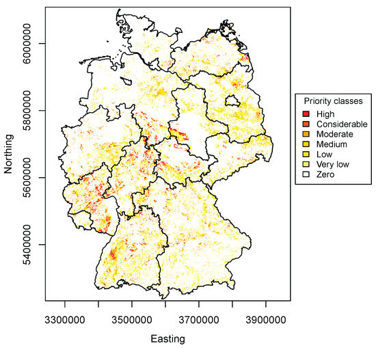 To identify priority regions, we were only interested in negative changes and therefore excluded positive changes of HTI. We summed up the negative changes of all six species and standardized absolute values to obtain a maximum of 1. This way, species obtained equal weights. High values indicated high priority. We labeled the values as priority classes from low to high. Areas classified as priority regions were summed up for the whole of Germany and for all federal states.