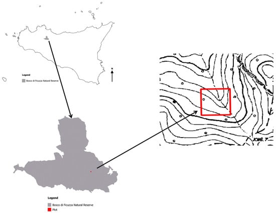 The study area is located on the island of Sicily (Italy), within the Nature Reserve “Bosco della Ficuzza, Rocca Busambra, Bosco del Cappelliere e Gorgo del Drago”, as classified according to the regional legislation about protected areas. It consists of a large protected area, covering more than 7000 ha. The experimental 1-ha plot is located within zone A of the Reserve, in Contrada Fanuso (Municipality of Godrano, Palermo Province; Figure 1). The plot lies at a mean altitude of 1000 m and falls within the mesomediterranean upper sub-humid bioclimatic belt [27]. Mean annual precipitation is 752 mm while mean annual temperature is 15.1 °C, with a mean maximum temperature of 20.5 °C and a mean minimum temperature of 9.8 °C [28]. Soils at the base of the northern slopes of Rocca Busambra are predominantly sandy loam; they are deep and developed enough to be well-suited to supporting tree vegetation [29].