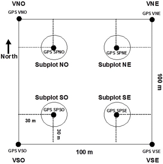The sampling design used in the experimental area to detect forest attributes followed the standard procedure adopted under the project PRIN 2007, “Innovative methods for the identification, characterization and management of old-growth forests in the Mediterranean environment” (e.g., [37]). The experimental area constitutes a square plot of 100 × 100 m (total area of about 1 hectare), with sides perpendicularly oriented to the cardinal directions N–S and E–W (Figure 2).