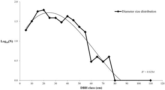 Diameter frequency distribution of the forest stand fitted well with a fourth-degree polynomial distribution with a typical rotated-sigmoid shape (Figure 3). Both are considered characteristic trends of diameter distribution of mature or old-growth forests [42,43].