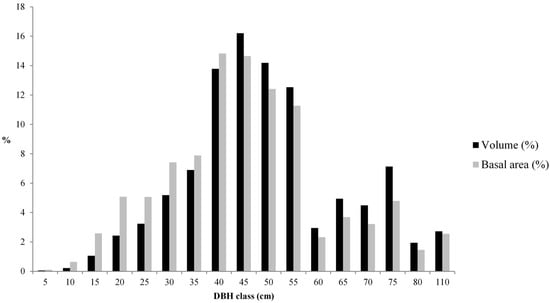More than 50% of total volume and basal area was among 40 and 55 cm DBH classes (Figure 4). About 4% and 8% of volume and basal area, respectively, fell in the DBH classes lower than 20 cm. Interestingly, almost one quarter of the total volume fell within DBH classes higher than 60 cm, including the largest trees. Overall, volume was slightly shifted towards the highest DBH classes with respect to basal area, and vice versa.