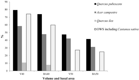 Considerable differences in the relative contribution to volume and basal area of largest stems by each tree species were found. Quercus pubescens made a major contribution, whereas Quercus ilex played a quite minor role in that respect (Figure 5). Almost 80% and 50% of total Quercus pubescens volume came from stems with DBH higher than 40 cm, and higher than 50 cm, respectively. Also, more than 40% of Quercus pubescens and more than 50% of Acer campestre total volumes were represented by stem diameters larger than 50 cm.