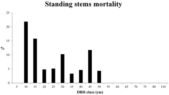 The highest stem mortality was found in the 10 and 15 cm DBH classes (Figure 6). This parameter displayed fluctuating values among DBH classes, but mortality occurred only in the DBH classes lower than 50 cm. On average, stem mortality was about 8% of the total living stems.