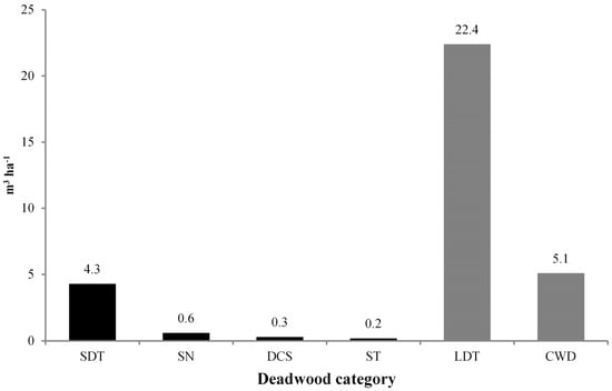 Relative contribution of each deadwood category to total deadwood volume (m3 ha−1).