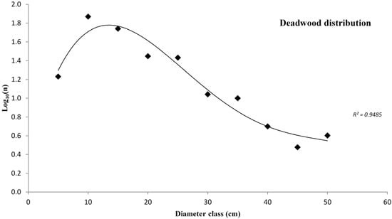 Diameter frequency distribution of all dead elements of the forest stand, either standing or lying (Figure 8), fitted well with a fourth-degree polynomial distribution with a typical rotated-sigmoid shape.