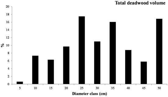 Deadwood was represented in all the diameter classes from 5 cm to 50 cm, but its volume was not equally distributed among them. Almost half of dead elements were found in the medium diameter classes, between 25 and 35 cm (Figure 9). Fine (DBH ≤ 20 cm) and coarse (DBH ≥ 40 cm) dead elements were also well-represented, accounting for about one quarter and more than one-third of the total deadwood volume, respectively.