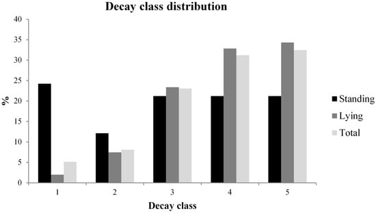 Wood decay classes 3 and 4 had the largest share of both standing and lying deadwood (Figure 10). However, standing deadwood was more common than lying deadwood in the first two decay classes, whereas lying was prevalent in the highest three. It is worth highlighting that highly decayed dead elements had the largest share of total and lying deadwood volume.