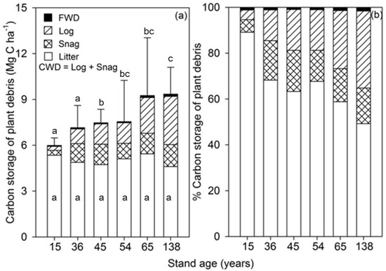 The investigated C storage of plant debris increased steadily and significantly with increasing stand age, from 6.0 ± 0.5 Mg·C·ha−1 in the 15-year-old stand to 9.3 ± 1.8 Mg·C·ha−1 in the 138-year-old stand (F = 7.3, p = 0.001; Figure 1a). The increase was mainly attributed to the increase in woody debris, especially in CWD, because the C storage of the litter represented an age-independent pattern with 4.6−5.4 Mg·C·ha−1 in the six larch stands (F = 0.4, p = 0.821; Figure 1a). The CWD C accounted for 91−97% of the C storage of woody debris. Specifically, the C storage of woody debris significantly increased from 0.7 ± 0.2 Mg·C·ha−1 in the 15-year-old stand to 2.3 ± 1.0, 2.7 ± 0.4, 2.4 ± 1.3, 3.8 ± 2.6 and 4.7 ± 1.3 Mg·C·ha−1 in the 36-, 45-, 54-, 65-, and 138-year-old stands, respectively (F = 8.7, p < 0.001).