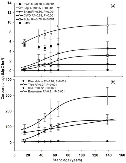 where CDT is the C storage of each component of plant debris and tree biomass and age is the forest stand age. W, α and λ are the coefficients of the function. Due to different trends, we plotted the C storage of the soil and total ecosystem against the stand age using a simple linear model (Equation (2)) and a revised sigmoidal model (Equation (3)), respectively: