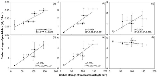 Relationships between carbon storage in plant debris and in live tree biomass. (a) Fine woody debris; (b) fallen logs; (c) standing snags; (d) coarse woody debris; (e) woody debris; and (f) litter.