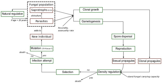 for Z values comprised in , otherwise the maximal fitness value of 1 is systematically assigned to the trait values exceeding the value. According to preliminary sensitivity analysis, we specified here uniformly in all stands a strong selection pressure through a value of 20 and a phenotypic optimum of 10, a value much greater than the mean trait value of the initial fungal populations close to 0 (see [20,32,35]). The resistance R of a stand is included in , and , where S is the mean susceptibility of the stand to the pathogen. The outcome of each infection attempt (success or failure) by a propagule i in a stand x is drawn from a binomial law weighted by a probability of success . When a propagule successfully infects a tree, a new individual is created, otherwise the propagule is removed from the stand. Here, for the sake of simplicity, each successful infection leads unavoidably to host death. This simplification is consistent with earlier results indicating an important vulnerability of maritime pine to A. ostoyae [44]. At the mutation step, the genotype of each individual mutates at a rate of per locus as in [20] according to the K-allele model [60]: when a mutation occurs, a new allele is drawn randomly among the 200 possible alleles. Given the high variance of allelic effects (), mutation is likely to generate substantial genetic variability during simulations. Due to the saprotrophism ability of the fungal pathogen [45], when an infected tree is cut (see next sub-paragraph), the fungal individual established in this tree can persist on dead substrate in the stand with a probability s, where s designates the saprotrophic ability. The saprotrophs remaining in stumps of cut trees continue to disperse both asexually and sexually until their age reaches the maximal age , and thus contribute to the production of propagules each year. Finally, a natural regulation of individuals according to their age occurs, those of age greater than are removed from the landscape. Based on [61], we set a life time of each fungal individual to 20 years. At the forest scale, this value allows clonal structures composed of several individuals at the parasitic or saprotrophic stage to persist during the whole simulation process, which is in agreement with the very long life-span of Armillaria organisms (e.g., [56]). Figure 1 summarizes the modeled evolutionary cycle and the different possible living states of the pathogenic fungus.