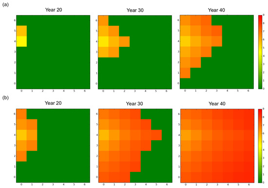Spatial distribution of the mean virulence level over the forest landscape, at years 20, 30 and 40, for a rotation length of 15 years. Dark green corresponds to healthy stands. The other colors inform about the mean genetic value of the local fungal sub-population in each infected stand. (a) mostly clonal fungal pathogen profile fp1 (clonality rate ); (b) mostly sexual fungal pathogen profile fp2 (). In both cases, the starting genetic variance was 4.06 (default scenario). The mean fungal genetic values were computed in each stand from the 50 independent replicates simulated.