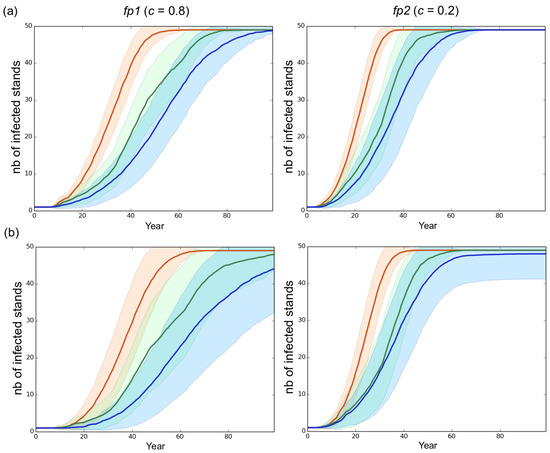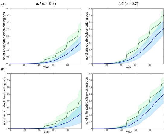 Number of anticipated clear-cuttings operations. In our simulations, sanitary thinnings occurred at 15 and 32 years, i.e., at the juvenile–adult and adult–mature transitions, respectively. An anticipated clear-cutting operation was triggered (end of rotation) in a stand when the number of healthy trees remaining after thinning was lower than 150. (a) high initial genetic variance of 4.06 in the starting fungal population (default scenario); (b) reduced initial genetic variance of 1.63 in the starting fungal population. Left column: mostly clonal fungal profile fp1 (clonality rate ). Right column: mostly sexual fungal profile fp2 (). Green and blue represent a rotation length of 30 and 50 years respectively. Each line is the mean of 50 independent replicates simulated. Each colored area corresponds to the standard deviation of the 50 replicates simulated.