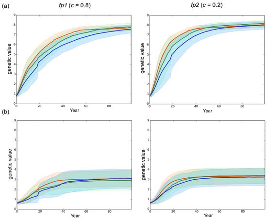 Effect of the rotation length on virulence evolution. The genetic value is the sum of the allelic effects at the 10 loci involved in the variability of the trait. (a) high initial genetic variance of 4.06 in the starting fungal population (default scenario); (b) reduced initial genetic variance of 1.63 in the starting fungal population. Left column: mostly clonal fungal profile fp1 (clonality rate ). Right column: mostly sexual fungal profile fp2 (). Red, green and blue represent a rotation length of 15, 30 and 50 years, respectively. Each line is the mean of 50 independent replicates simulated. Each colored area corresponds to the standard deviation of the 50 replicates.