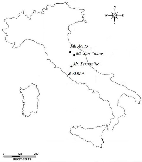 The studied soils came from three calcareous massifs of the central Apennines chain (Italy): Mount Terminillo (42°28′ N, 12°59′ E), Mount San Vicino (43°19′ N, 13°03′ E), and Mount Acuto (43°28′ N, 12°41′ E) (Figure 1). At each site, two European beech (Fagus sylvatica L.) forests were selected on the north-facing slope, at 800 and 1000 m above sea level (a.s.l.), and with an inclination ranging from 25° to 40°. The mean annual air temperature (MAAT) and the mean annual precipitation (MAP) were recovered from the climatic data supplied by Centro Appenninico “C. Jucci” [31] for Mount Terminillo (1956–2014 series), and from Spina et al. [32] and Amici and Spina [33] for both Mount San Vicino and Mount Acuto (1950–2000 series). According to these data, the study areas at 800 and 1000 m had a MAAT of 10 °C and 9 °C, respectively. The MAP of each site was similar at the two altitudes and it was 1248 mm at Mount Terminillo, 825 mm at Mount San Vicino, and 1430 mm at Mount Acuto. As the only detailed temperature series updated to nowadays was that of Mount Terminillo, to take into consideration temperature anomalies of the last years in each study site, we measured air temperature from March 2014 to March 2016 by YSI thermistors associated with UTL-2 dataloggers (Geotest, Zollikofen, Switzerland). The means obtained by the two-year measurements were 0.2–0.4 °C higher than those of the long series, in agreement with the data of the last two years of the Mount Terminillo series (2013 and 2014) and with the reports of Pasquale et al. [34] and Desiato et al. [35]. However, the MAAT difference between 800 and 1000 m remained about 1 °C. Concerning temperature anomalies, in the years 2003, 2012 and 2015, the study sites experienced very warm and dry summers, but their effect on the soil can be considered as similar at both 800 and 1000 m. All the soils had a mesic soil temperature regime and an udic soil moisture regime.