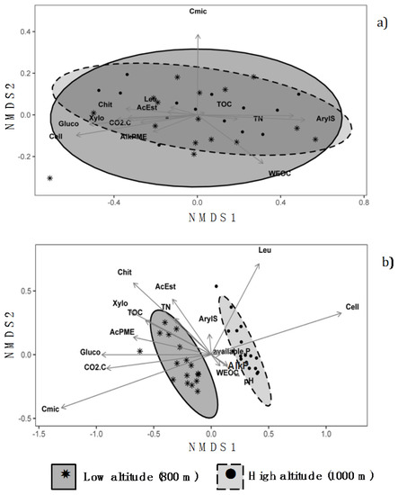 Non-metric multidimensional scaling (NMDS) plots showing the similarity/dissimilarity among (a) organic; and (b) mineral horizons between the soils under Fagus sylvatica forests at the two altitudes of 800 m and 1000 m in central Apennines, Italy. The drawn ellipses are at 95% confidence. (Legend: TOC: total organic carbon; TN: total nitrogen; WEOC: water extractable organic carbon; available P: available phosphorus; Cmic: microbial biomass carbon; CO2-C: CO2 evolved during basal respiration experiments; Cell: cellulase; Xylo: xylosidase; Gluco: β-glucosidase; Chit: chitinase; AcPME: acid phosphomonoesterase; AlkPME: alkaline phosphomonoesterase, AcEst: acetate esterase; ArylS: arylsulfatase; Leu: leucine aminopeptidase).