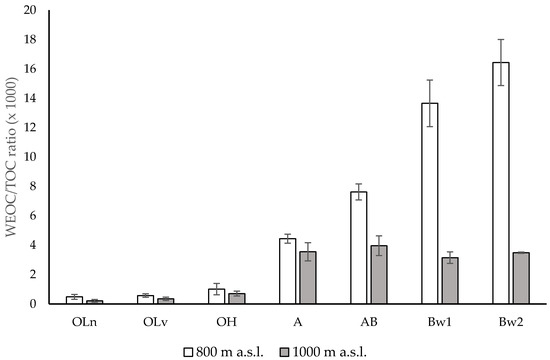 WEOC/TOC ratio of the different horizons along the soils under Fagus sylvatica forests at two altitudes, 800 m and 1000 m above sea level (a.s.l.), central Apennines, Italy. Error bars are the standard errors (n = 3).
