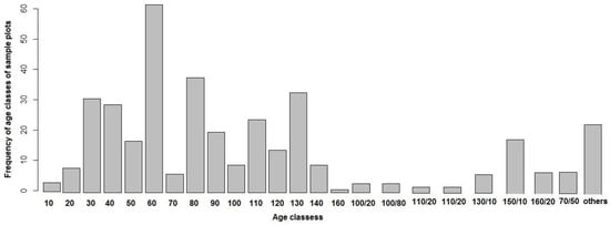 Field data were collected through a forest inventory carried out by the state forest service of Baden-Württemberg in summer 2007 where tree measurements were recorded from 375 permanent sample plots (Figure 1). The sample plots, each measuring 12 m in diameter, are distributed systematically over the study area in a 100 m × 200 m grid. For each plot, trees were sampled in concentric circles originating from the centre of the plot in such a way that trees with diameter at breast height (dbh) smaller than 7 cm are sampled only up to a radius of 2 m; trees between 7 cm and 15 cm are measured within a radius of 3 m; trees between 15 cm and 30 cm are measured up to 6 m distance; and trees with dbh over 30 cm are measured up to the maximum distance of 12 m radius. Two dominant heights of each main tree species and one dominant height of other mixed species were measured. The remaining tree heights were predicted by species-specific stand height curves developed by the Forest Research Institute, Baden-Württemberg, Germany. The single tree timber volume was calculated using the taper functions of Kublin [32], and the total volume at plot-level in cubic meters per hectare was derived by summing up the individual tree volumes weighted by the inverse of the corresponding sample plot area (Table 1). More detail about the methodology can also be found in Latifi et al. [8]. Figure 2 shows the distribution of the age classes, ranging from 10–160 years, for trees in all sample plots in the study area.