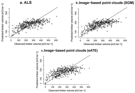 Observed versus predicted forest timber volumes in the study using multiple linear regression models: (a) ALS-based; (b) Image-based point clouds using SGM, and (c) Image-based point clouds using eATE.