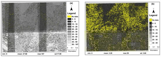 The relative performance of the two image-matching algorithms, in terms of density of point clouds (points per m2) and their ability to obtain true matches for existing trees, is further highlighted in Figure 5 where image-based point cloud densities from SGM and eATE algorithms for a subset of the study area are compared. For SGM, a mean point density of 27.66 m2 was calculated. This value is significantly higher when compared to a mean density of 3.29 m2 for eATE point clouds. Similarly, it was observed that eATE produced considerably higher numbers of no data pixels, thereby suggesting a higher rate of failure in obtaining valid data points during the image matching procedure. Conversely, for SGM, very few pixels with no data in the point clouds were observed.
