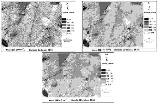 Forest timber volume maps (m3 ha−1) of the study area from multiple linear regression estimations; (a) using ALS; (b) using image-based point clouds from SGM; and (c) using image-based point clouds from eATE.